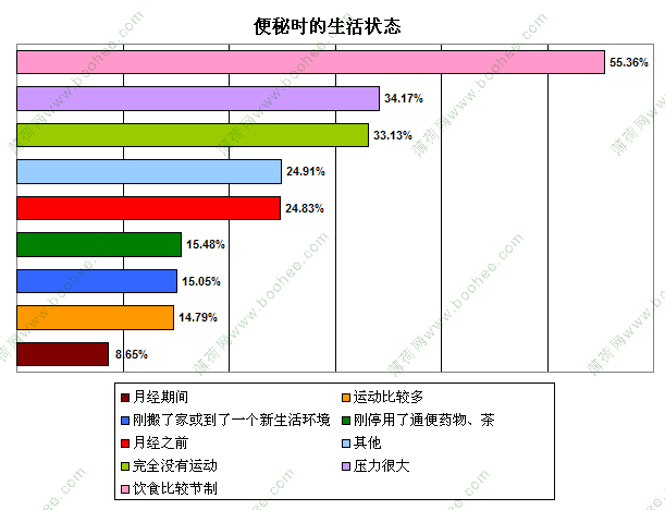 4,平时很少喝水。如果我们的身体缺水,大便中的水分就会被大肠吸收出去,结果大便就会变得干燥。硬结的大便很难润滑地通过直肠和肛门,这就造成排便的痛苦,甚至给肛门造成伤害,引起肛裂等不良症状。