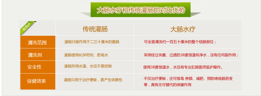 大肠水疗,能够及时清除大肠内的有害宿便和肠馁毒素,解除便秘痛苦,对痔疮、腹胀有显著疗效,同时可有效预防结肠炎、直肠癌、结肠癌,肝癌等消化系统疾病。