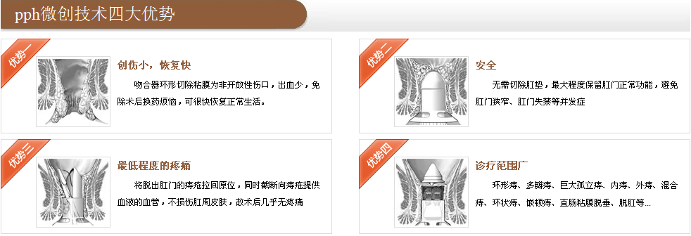 PPH手术在观念上改变了传统手术,使手术时间显著缩短,全程只要8分钟,达到、微创的手术效果,术后并发症也明显降低。患者2、3天即可出院,大约1周后即可恢复如初。PPH以其显著的优势成为肛肠患者的。