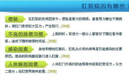 从引发原因来看:肛裂是由于比如说便秘、痔疮等原因或者先天性肛门狭窄等外伤、感染或者生理的原因导致的;肛门皲裂湿疹、皮炎、肛门瘙痒症等肛门皮肤上的疾病引起的。