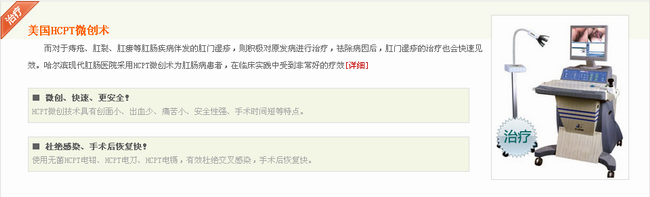HCPT消融技术:武汉博仕肛肠医院引用国际HCPT消融技术,是在高频电容场下,组织内带电离子和偶子在两极间高速震荡产热,当电离子耗竭至间液干结时,仪器自动停止工作,不产生炭化立即脱落,所以具有可控性好,局限性好,定向性好,产热快等特点,对各种肛肠疾病具有。治疗结束自动报警、不碳化、不结痂、无异味、血管闭合好、、、、和并发症等优点。是目前肛肠治疗的前沿技术。