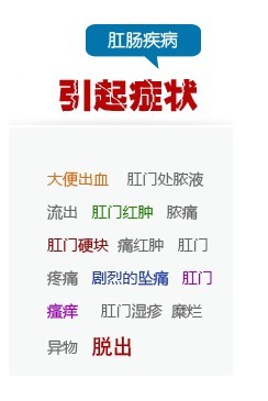 | 肛肠病常见症状有:肛门和腹部疼痛,便血,便秘,肛门部有物脱出,肛门部流粘液或血水,肛门部肿块突起,肛门直肠异物感,腹泻,粘液血便,排便困难,大便外形改变,恶寒发热,腹满,恶心呕吐,腹部包块,贫血等。 | ![]() |