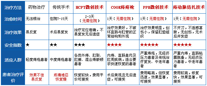 (1) 内痔的极佳治疗方法:PPH痔上粘膜环切术、COOK痔疮枪技术、DG-HAL痔动脉结扎术。 内痔初是便血,后可发展为痔核脱出于肛门口,便后可缩回,再发展下去痔核脱出肛门口不会缩回,需用手推、送回肛门。有了这些症状,应尽快采取上述三种微创治疗。