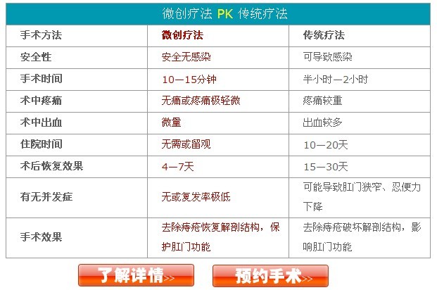 从众多治疗痔疮失败的经历中我们发现,治疗痔疮的方法是手术。但是,经历过传统手术治疗的病人都知道,康复时间长,住院10-20天,另外传统手术有创伤、痛苦较大,且易肠。在这个快节奏生活的今天,患者都期望有种效果好且便捷省时的新疗法。为此武汉博仕肛肠医院结合临床实际引进了微创、的绿色疗法-微创疗法。