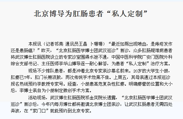 武汉晚报讯(记者祁燕 通讯员王晶 卜珊珊)“最近如厕出现喷血,是痔疮发作还是患肠癌?”昨天,“北京肛肠医学博士团武汉巡诊”首诊,众多肛肠疑难病患者将武汉博仕肛肠医院设立的专家诊室围得水泄不通,中国中医科学院广安门医院主任医师、博士生导师李华山教授逐一耐心解答,为患者“私人定制”治疗方案。