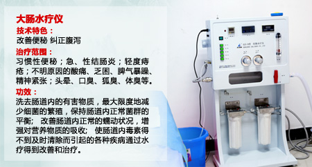 三、肠道炎症:采用大肠水疗,通过结肠洗肠,调节肠道菌群,增强肠道蠕动,清除肠腔内和肠粘膜上的有害代谢物质和霉菌。