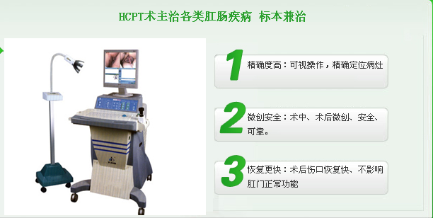 HCPT微创技术治疗肛裂,具有不开刀、、、,,门诊微创即可,等优点,是目前医学界一致公认治疗肛肠疾病的理想方法。